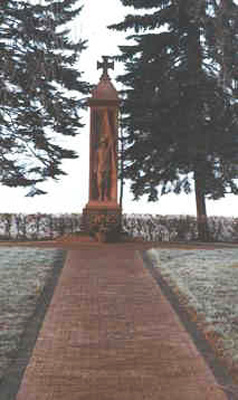 Schmale Stele mit krönendem Tatzenkreuz für die Gefallenen und Vermissten beider Weltkriege.