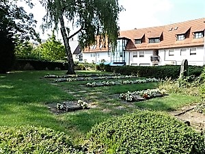 Alter Friedhof „Bahnhofstraße“ Gerokstraße 8/3. Kriegsgräberstätte: Bodenplatten mit den Namen der (mehrheitlich zivilen) Kriegstoten. Teilweise waren einzelne Metallbuchstaben auf den Bodenplatten nicht mehr vorhanden, die jeweiligen Angaben konnten jedoch trotzdem problemlos gelesen werden. Dazu befinden sich etwas entfernt die Gräber von vier in den letzten Kriegstagen verstorbenen ausländischen Zivilarbeitern. Auf den schlichten Holzkreuzen sind nur die Namen der Toten angegeben, weitere Angaben fehlen.