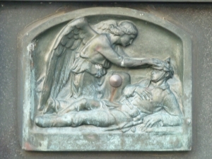 Alter Friedhof. Familiengrabstätte mit der Darstellung eines sterbenden Soldaten, dem eine weibliche Engelsgestalt einen Siegeskranz auf den Helm (volkstümlich „Pickelhaube“ genannt) legt. Überdies ist eine Fotografie des Gefallenen eingefügt.