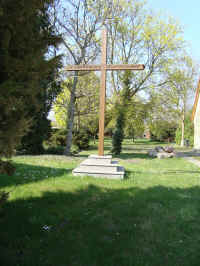 Ein Holzkreuz neueren Datums auf dem alten Kirchplatz, die Kirche ist durch einen Neubau ersetzt, der Friedhof jetzt außerhalb des Dorfes, ohne Namen.
