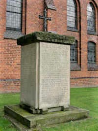 An der Kirche von Bruchhausen Ehrenmal für die Opfer beider Weltkriege: Auf quadratischem Sockel eine Stele, auf der Deckplatte ein Kreuz. An den vier Seiten die Namen der siebenundfünfzig und hundertsieben Kriegstoten.