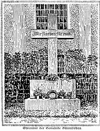 Denkmal-Nr. 09248141 Alte Ortslage Brunndöbra, Ludwig-van-Beethoven-Straße Denkmal für die gefallenen und vermissten Mitglieder der Kirchengemeinde Brunndöbra. Ein zirka 2,50 m hohes Kreuz aus Werkstein (wohl Theumaer Fruchtschiefer) mit Inschrift: auf einem Basisblock, lagerhaftem Postament und Grundplatte, alles materialeinheitlich. Auf dem oberen Sockel ruht ein zerbrochenes Schwert und darüber ein Stahlhelm als mahnendes Wahrzeichen für die nicht aus dem Krieg Zurückgekehrten. Geschaffen wurde es von dem Bildhauer und Architekten E. Heilmann aus Reichenbach i. V. Die Einweihung erfolgte im November 1920.
