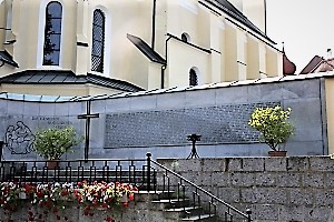Gedenkwand am Aufgang zur Kirche; zusätzlich Hinweise zu Soldaten von privaten Gedenksteinen