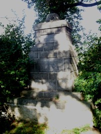 Denkmal auf dem Friedhof aus gemauerten Granitsteinen, mit eingelassener Namenstafel und gekrönt von einem Stahlhelm. Gedenken auf Familiengrab