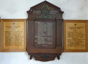 Gedenktafel aus Eichenholz für den 1. Weltkrieg an der südlichen Langhauswand in der katholischen Pfarrkirche St. Maria Magdalena. Die Namenstafeln für den 2. Weltkrieg aus hellem Holz wurden später ergänzt.