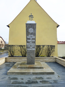 Obelisk aus Stein vor der Friedhofskapelle, enthüllt 1962. Hier sind auch die nicht-katholischen Gefallenen verzeichnet. Die Schreibweise der Namen weicht zum Teil ab.