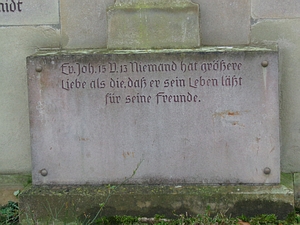 Sockel: Ev. Joh. 15 V. 13 Niemand hat größere Liebe als die, daß er sein Leben läßt für seine Freunde.