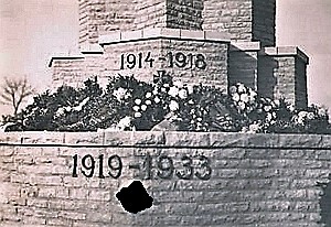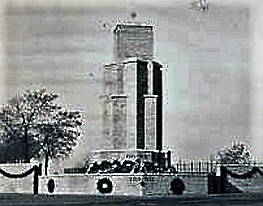 Denkmal für die Gefallenen des 1. Weltkriegs (und der Toten der NSDAP): gemauert in Form einer Festungsanlage mit Turm.