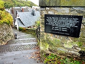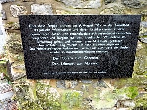 Über diese Treppe wurden am 20. August 1935 in der Dunkelheit 41 jüdische Waisenkinder und deren Erzieher/Erzieherinnen in einer pogromartigen Aktion von nationalsozialistisch gesinnten einheimischen Bürgerinnen und Bürgern aus dem israelitischen Waisenhaus am Schlossberg geholt und hinunter zum Marktplatz getrieben. Am nächsten Tag wurden sie nach Frankfurt deportiert. Das Heimleiterehepaar Kadden und vermutlich auch viele der Kinder wurden in Konzentrationslagern ermordet.