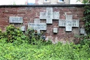 Steinkreuze und Inschriftentafeln ohne Namen (Zweiter Weltkrieg, aus den 50er Jahren). In der Kirche