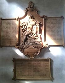 Gedenktafel Kirche Den Helden unserer Pfarrfamilie zum Gedächtnis (Namen) Wir wissen nicht wo sie sind (Namen Vermisste) Gott der Allwissende möge sie bergen in seine Hände.