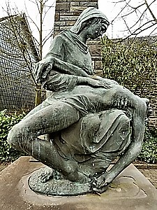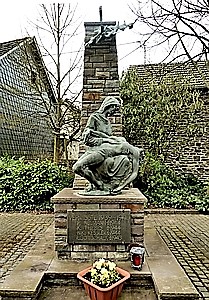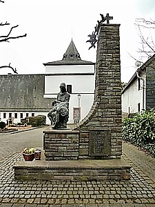 Dorsel, Verbandsgemeinde Adenau, Landkreis Ahrweiler, Rheinland PfalzPLZ 53533 Auf dem Platz bei der Pfarrkirche St. Sebastianus in Dorsel ein Denkmal für die Gefallenen beider Weltkriege. Auf dem hinteren Teil eines Bruchsteinsockels ein Pfeiler aus Bruchstein, den oberen Abschluss bildet ein Kreuz darunter fliegt ein Vogelschwarm (Tauben ?). Kreuz und Vögel aus Metall. Auf dem unteren Sockel eine Bronzeskulptur sie zeigt Maria, die einen sterbenden Krieger auf den Knien hält ähnlich einer Pietá. Auf der Bodenplatte der Skulptur die Signatur des Künstlers „Carnessali“ und die Jahreszahl 1996 (Don Luciano Carnessali war ein italienischer Bildhauer und Pfarrer; er ist im Jahre 2001 verstorben). Teile des Denkmals sind jedoch älter. Ein Basaltlava-Platte an der Rückseite des Denkmals für die Gefallenen des Ersten Weltkrieges stammt sicher noch aus der Zeit vor dem 2. Weltkrieg. Zwei rechts und links an den Pfeiler angebrachte, geschliffene Basaltlava-Platten sind mit den Namen der Gefallenen beider Weltkriege versehen. Vor Kopf des Sockels eine dritte Platte mit den Namen der Vermissten des Zweiten Weltkrieges.