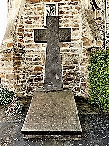 Kreuz liegt auf dem Boden eine Basaltlava-Platte mit den Namen der Gefallenen beider Weltkriege.