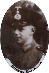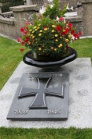Im Friedhof: Gedenktafeln mit Namen und Fotos aussen an einer Kapelle; zusätzlich Daten von