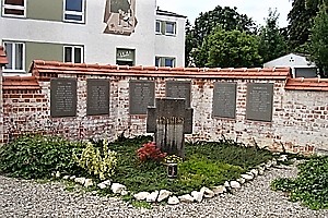 Denkmal auf dem Friedhof, dazu Daten von Grabsteinen