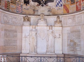 Inschrift rechte Tafel 1870 - HAT DEUTSCHLAND VERGEWALTIGUNGEN FRUEHER ERTRAGEN. SO ERTRUG ES SIE WEIL ES ZERRISSEN NICHT WUSSTE WIE STARK ES WAR. HEUTE GEEINT TRAEGT ES IN SICH DEN WILLEN UND DIE KRAFT DER ABWEHR ERNEUTER GEWALTTHAT – IN DIESEM KAMPFE IN DEM WIR KEIN ANDERES ZIEL VERFOLGEN ALS DEN FRIEDEN DAUERND ZU SICHERN WIRD GOTT MIT UNS SEIN. KOENIG WILHELM 19. VIII. MIT BEGEISTERUNG WERDEN MEINE TRUPPEN AN DER SEITE IHRER RUHMGEKROENTEN ARMEE FUER DEUTSCHES RECHT UND DEUTSCHE EHRE DEN KAMPF AUFNEHMEN MOEGE ES ZUM WOHLE DEUTSCHLANDS UND ZUM HEILE BAYERNS ENDEN. KOENIG LUDWIG II. 20. VII. ES IST MIR EIN ERHEBENDER GEDANKE ZUR KROENUNG DES DEUTSCHEN EINIGUNGSWERKES DURCH ANBIETUNG DER KAISERWUERDE DEN ERSTEN SCHRITT ZU THUN. KOENIG LUDWIG II. 4. XII. 1871 – UNS UND UNSEREN NACHFOLGERN IN DER KAISERKRONE WOLLE GOTT VERLEIHEN ALLEZEIT MEHRER DES REICHES ZU SEIN; NICHT IN KRIEGERISCHEN EROBERUNGEN SONDERN IN DEN WERKEN DES FRIEDENS AUF DEM GEBIETE MATERIELER WOHLFAHRT FREIHEIT UND GESITTUNG. KAISER WILHELM I. 18. I. MAECHTIG UND SIEGREICH HAT SICH DAS VEREINTE DEUTSCHLAND IM KRIEGE BEWAEHRT UNTER SEINEM HOECHSTEN FELDHERRN, MAECHTIG UND FRIEDLIEBEND WIRD DAS GEEINIGTE DEUTSCHE REICH UNTER SEINEN KAISERN SEIN. REICHSTAGSADRESSE 10. XII. WIR DEUTSCHE FUERCHTEN GOTT UND SONST NICHTS IN DER WELT; GOTT WIRD MIT UNS SEIN. BISMARCKS REDE 6. II. 87.