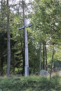 Gedenkstein und ein Hochkreuz am Querweg (Freiburg-Bodensee), ca. 1.5 km vor Engen von Riedöschingen kommend.
