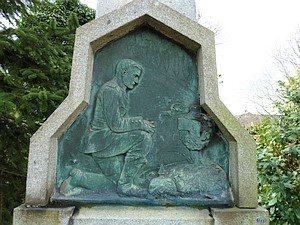 der gefallenen Krieger. Oberhalb der Platte Relief aus Metall, darauf links ein kniender, wohl betender