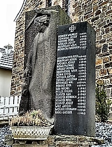 Esch, Ortsbezirk Holzweiler, Gemeinde Grafschaft, Landkreis Ahrweiler, Rheinland-PfalzPLZ 53501 Vor der Kapelle St. Michael in Esch ein Denkmal für die Gefallenen beider Weltkriege.Die Anlage besteht aus zwei Basaltlava-Blöcken, auf dem Block links Relief des Erzengels Michael der mit seiner rechten Hand ans Maul des Drachens fasst und mit dem über den Kopf erhobenen Arm, in der Hand ein Schwert oder langen Dolch, auf den Drachen einstechen will, der sich von der linken Seite des Blocks herumwindet, auf dieser Seite auch ein hohes Kreuz. Auf dem etwas kürzeren Bloch rechts die Gefallenen beider Weltkriege, darüber ein Eiserne Kreuz. Das Denkmal ist 1970 vom Junggesellenverein restauriert worden