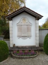 Das mit etlichen Verzierungen ausgestattete Denkmal auf dem Friedhof bei der Kirche St. Dionysius befindet sich an der Innenseite der Friedhofsmauer und wurde offenbar im Jahre 1921 errichtet. Es zeigt unter einem dem Eisernen Kreuz nachempfundenen Kreuz die Darstellung der Heiligen Maria in königlichem Ornat mit Krone und Zepter. Das Jesuskind auf ihrem linken Arm hält in seiner linken Hand den Reichsapfel. In die untenstehende Auflistung sind noch Namen von Gefallenen des Zweiten Weltkriegs und von Kriegsteilnehmern 1914/18 auf privaten Gedenksteinen aufgenommen.