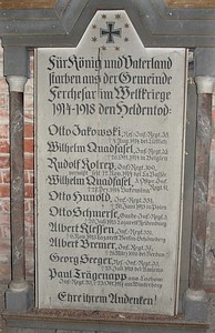 Die Gedenktafel des Krieges 1813-1815 enthält keine Daten. Aus dem Kirchenbuch konnten Daten zu einigen Namen gewonnen werden. Es ist kein Gedenken an Opfer des Krieges 1870/71 im Ort erhalten. Im Landesarchiv Potsdam ist eine Akte zur Errichtung des Denkmals der Einigungskriege in Brandenburg/Havel erhalten in dem ein Opfer aus Ferchesar aufgelistet wurde. Laut Todesanzeige haben Angehörige in Ferchesar 1942 einen Unteroffizier Walter Ueckert betrauert. Dieser war aber im Nachbarort Landin wohnhaft und wurde dort beurkundet und eingeordnet. In und um Ferchesar wurden einige Bewohner im Mai 1945 „erschossen aufgefunden“, unklar ist ob es Selbstmorde waren oder ob sie durch Kampfhandlungen getötet wurden. Dank an Herrn P. Vogt für Bilder der im Turmraum der Kirche abgestellten Gedenktafeln. Auf der Kriegsgräberstätte befindet sich Gedenken an drei deutsche Soldaten, aber keine Namen. Ob es genau die drei Namen sind, die im Sterberegister beurkundet wurden, ist nicht ersichtlich. In der offiziellen Kriegsgräberliste sind auch nur drei Unbekannte notiert und der Gefreite Brückner wurde mit Bleistift nachgetragen. Hier müsste eine Namenstafel angebracht werden. Zusätzliche Informationen in Blau vom Volksbund Deutsche Kriegsgräberfürsorge (www.volksbund.de/graebersuche).