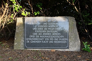 Gedenkstein NS-Opfer: Wir erinnern – und gedenken unserer 21 jüdischen Mitbürger und derer, die wegen ihrer politischen Einstellung oder aus anderen Gründen Opfer der Nationalsozialistischen Gewaltherrschaft von 1933-1945 wurden. Die Gemeinden Flacht und Niederneisen.