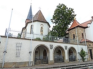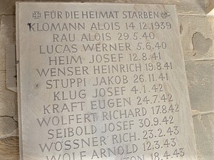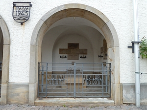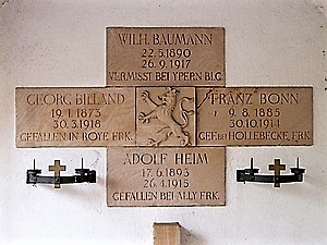 Neben dem Treppenaufgang zur Katholischen Kirche St. Margareta wurde 1933 die Gedächtnisstätte für die in den beiden Weltkriegen gefallenen Bürger der Gemeinde mit einem dreiteiligen Kreuzgewölbe als offene Krypta in den Kirchenhügel gebaut. Im Inneren hängen an den drei Wänden insgesamt vier Gruppen mit jeweils vier rechteckigen um eine kleinere quadratische Tafel angeordneten kleineren Steintafeln. Auf den Rechtecken sind die Namen und Lebensdaten der Kriegstoten zu lesen, die Quadrate zeigen die Abbildung eines Löwen oder eines Adlers. In einer Nische in der Mitte findet sich die Darstellung des auferstandenen Christus, zu dessen Füßen links und rechts jeweils ein Soldat ohne Helm kniet und zu dem Heiland hochblickt. Auf zwei liegenden Steintafeln stehen die Namen der Gefallenen und Vermissten des Zweiten Weltkriegs. Die drei zweiteiligen metallenen Eingangstore zum Inneren der Gedenkstätte weisen sowohl Tatzenkreuze als auch Inschriften auf. Links und rechts des mittleren Eingangs hängen zwei einem Wappen nachempfundene metallene Abbildungen mit den Jahreszahlen der beiden Weltkriege.
