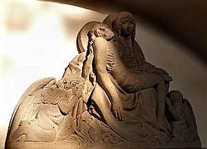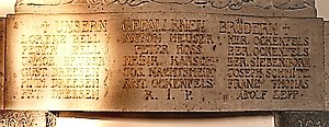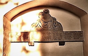 Franken (Pfarrkirche), Stadt Sinzig, Landkreis Ahrweiler, Rheinland PfalzPLZ 53489 In der Pfarrkirche St. Michael in Franken, in einer flachen Bogennische eine Pietá und links und rechts je ein Engel. Darunter eine auf zwei Konsolsteinen ruhende Steinplatte mit Widmung, darunter die Gefallenen des Ersten Weltkrieges und das R. I. P. Auf den Konsolköpfen die Jahreszahlen 1914 und 1918. Die Buchstaben sind goldfarben ausgemalt. Rechts und links des Denkmals hat man nach dem Krieg zwei weitere Platten mit den Namen der Gefallenen 1939 – 1945 angebracht. Oben auf den Platten „1939 GEFALLENE 1945“ und „1939 VERMISSTE 1945“ auch hier sind die Buchstaben goldfarben ausgemalt.