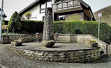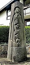 Fuchshofen, Verbandsgemeinde Adenau, Landkreis Ahrweiler, Rheinland PfalzPLZ 53533 An der Ecke des Bahnhofsweges in Fuchshofen eine Stele aus Basaltlava. Aus dem Stein herausgearbeitet ist das Relief einer Frauengestalt, die mit ihrem Mantel vier Krieger ? schützt von denen nur die Köpfe sichtbar sind, vielleicht eine moderne Ausführung einer Schutzmantelmadonna. Auf dem Sockel die Namen der Gefallenen beider Weltkriege und die Signatur des Bildhauers Georg Gehring aus Adenau