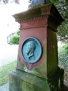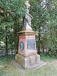 Waldfriedhof. Unweit der Friedhofskapelle befindet sich das vom Bildhauer und Steinmetzen H. Jucker aus Rastatt (1868-1922) geschaffene Denkmal im Eingangsbereich des Friedhofs. Es ähnelt einem Obelisken und wird nach oben von einer sitzenden Frauenfigur abgeschlossen, die in ihrer Rechten einen Siegeskranz hält.