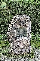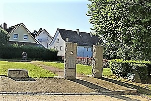 Steinsäulen, die linke davon mit Namenstafel, recht vom Eingang ein Stein am Boden mit Plakette