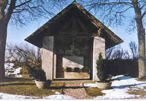Säule vor der Ortschaft und Denkmal in der Ortschaft, beide ohne Namen