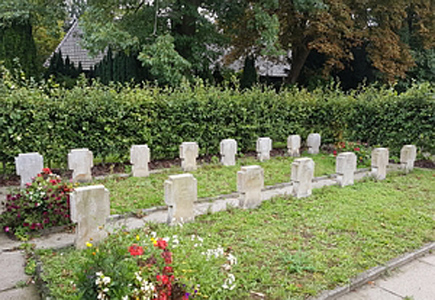Gepflegtes Gräberfeld mit elf Einzelgräbern, lt. Volksbund angeblich für baltische Zwangsarbeiter, die in den Jahren 1942-1944 gestorben sind,