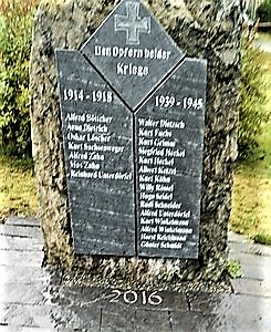 Großer unbehauener Felsblock in der Dorfmitte. Davor dreigeteilte Platte aus Schiefer mit Widmung und Namen der Gefallenen beider Kriege in jeweils alphabetischer Reihenfolge. Errichtet ca. 1936, 2016 erneuert.