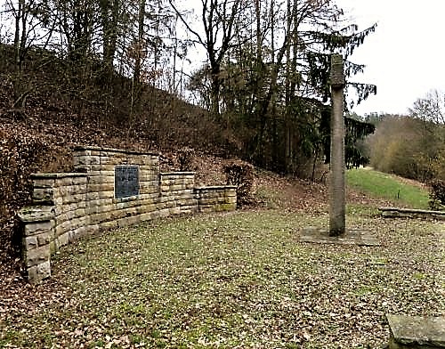 Gebogene Steinwand mit einer Gedenkplatte in der Mitte, davor ein großes Steinkreuz