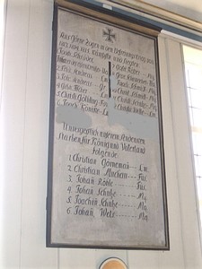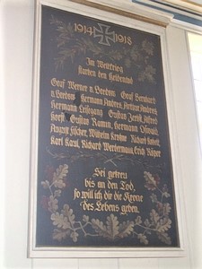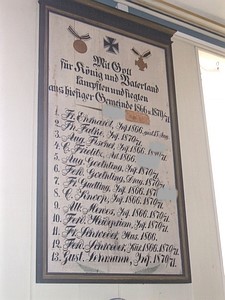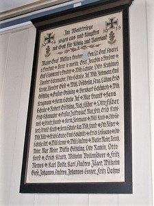 Obelisk für die Gefallenen des Ersten Weltkriegs vor der Kirche. Beigestellt eine Namenstafel für die Gefallenen des Zweiten Weltkriegs (seit 2015). Gedenktafeln in der Kirche. Einzelgedenken auf dem örtlichen Friedhof. Deutsches Soldatengrab. Polnisches Soldatengrab