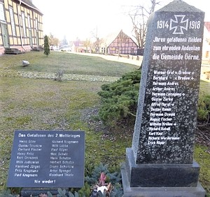 Die Namen der Kriegsopfer des 2. Weltkriegs wurden in Görne lange Zeit nicht gesammelt. Nach Angaben einer Ortseinwohnerin konnte hier 2011 eine erste Liste veröffentlicht werden. Im Ort wurde dann um 2015 neben dem Denkmal des 1. Weltkriegs eine Namenstafel mit den Gefallenen des 2. Weltkriegs angebracht. Die Namen wurden aus dem Sterberegister, dem Kirchenbuch, den Todesanzeigen und den Todeserklärungen der Vermissten ergänzt. Auch die Namen der Gefallenen des 1. Weltkriegs konnten mit Daten ergänzt werden. Im Mai 1945 fanden im Ort viele Selbstmorde statt und danach sind viele Kinder und Alte an Seuchen, Krankheiten und Schwäche gestorben. In der offiziellen Kriegsgräberliste ist zu den zwei unbekannten polnischen Soldaten vermerkt: „Es wird vermutet, daß sie von der SS erschossen wurden“. In Görne waren auch acht US-Flieger bestattet. Diese wurden wie überall üblich nach 1945 auf US Kriegsgräberstätten außerhalb Deutschlands umgebettet („außerhalb des Feindeslandes“). Die Träger des Eisernen Kreuzes im 1. Weltkrieg sind mit einem EK nach dem Namen markiert. Ergänzende Daten zu einigen Gefallenen des Krieges 1813-1815 entstammen dem Kirchenbuch. Ergänzende Daten zu adligen Gefallenen aus „Ehrentafel der Kriegsopfer des Reichsdeutschen Adels 1914-1919“ sind kursiv gekennzeichnet. Zusätzliche Informationen in Blau vom Volksbund für Kriegsgräberfürsorge(www.volksbund.de/graebersuche).