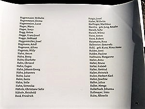 Gedenkstätte Grafeneck e. V., Grafeneck 3. Im Außengelände umfasst der künstlerisch gestaltete Gedenkbereich eine offene Kapelle, einen sogenannten Alphabetgarten und ein Gedenkbuch mit den Namen von in der Tötungsanstalt ermordeten Menschen. Auf der im Foto festgehaltenen Seite des Gedenkbuchs findet sich neben vielen anderen auch der Name des aus Schanbach gebürtigen Euthanasieopfers Wilhelm Hailer.
