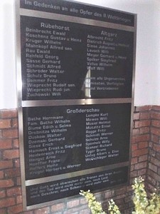 Tafel 2. Weltkrieg Großderschau (Namen) Rübehorst (Namen) Altgarz (Namen) …… sowie alle Ungenannten, Vermissten, Verfolgten und Vertriebenen. Und Gott wird abwischen alle Tränen von ihren Augen, und der Tod wird nicht mehr sein, noch Leid, noch Geschrei, noch Schmerz wird mehr sein …..Offb.22,4