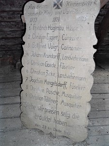 Tafel Aus diesem Kirchspiel starben für König und Vaterland 1813, 1814, 1815. (Namen) Siehe wir preisen selig die erduldet haben. Den 28ten Decbr. 1817.“