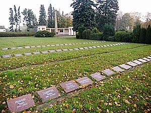 Auf dem städtischen Friedhof befinden sich eine Gedenkstätte für die Opfer des Faschismus. Es wurde ein rundes Denkmal in Form eines Tempels errichtet mit Namen im oberen inneren Ring. Daneben befindet sich ein Gräberfeld. An beiden Stellen befinden sich auch Namen von ehemaligen Verfolgten, die nach dem Mai 1945 friedlich verstorben sind. Diese werden hier natürlich nicht mit aufgelistet. Die Inschriften und Namen auf der sowjetischen Kriegsgräberstätte sind alle in kyrillischer Schrift und können hier nicht fehlerfrei deutsch angegeben werden. Auch hier sind die meisten Soldaten erst nach dem Mai 1945 verstorben.