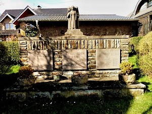 Denkmal hinter der Filialkirche St. Donatus und Jakobus Bruchsteinmauer mit drei Steinplatten darauf die Namen der Gefallenen. Auf der Mauer Skulptur, Darstellung: drei Frauen