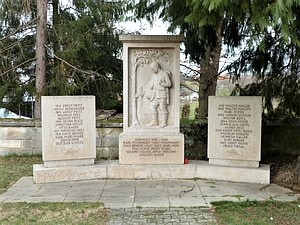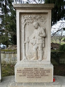 Dreiteiliges Kriegerdenkmal an der Friedhofsmauer. Das Relief in der Mitte zeigt einen an einem Grab trauernden Soldaten, darunter und auf zwei Tafeln links und rechts des Reliefs sind die Namen der Gefallenen und Vermissten der beiden Weltkriege aufgelistet. Unweit des Denkmals befindet sich das Grab eines Gefallenen aus der Endphase des Zweiten Weltkriegs.