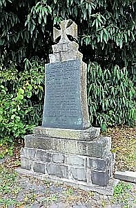 Auf einem gemauerten Sockel – eine Gedenkplatte an einer Steinplatte befestigt. Oben ein Deutsches Kreuz