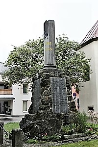 An der Kirche: Gedenktafel (1848-1882); bei der Kirche: Steinpyramide mit vier Gedenktafeln, oben mit runder Säule; zusätzlich Daten von privaten Gedenksteinen