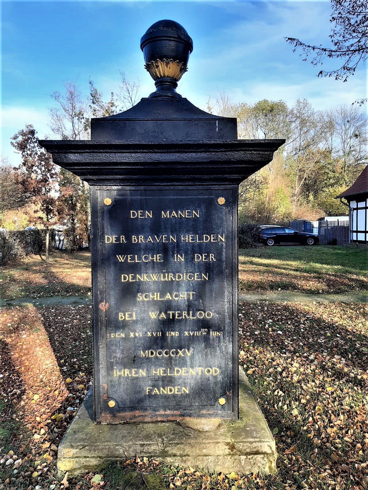 Links Den Manen der Braven Helden in der Denkwürdigen Schlacht bei Waterloo den XVI XVII und XVIIIten iun MDCCCXV Ihren Heldentod fanden