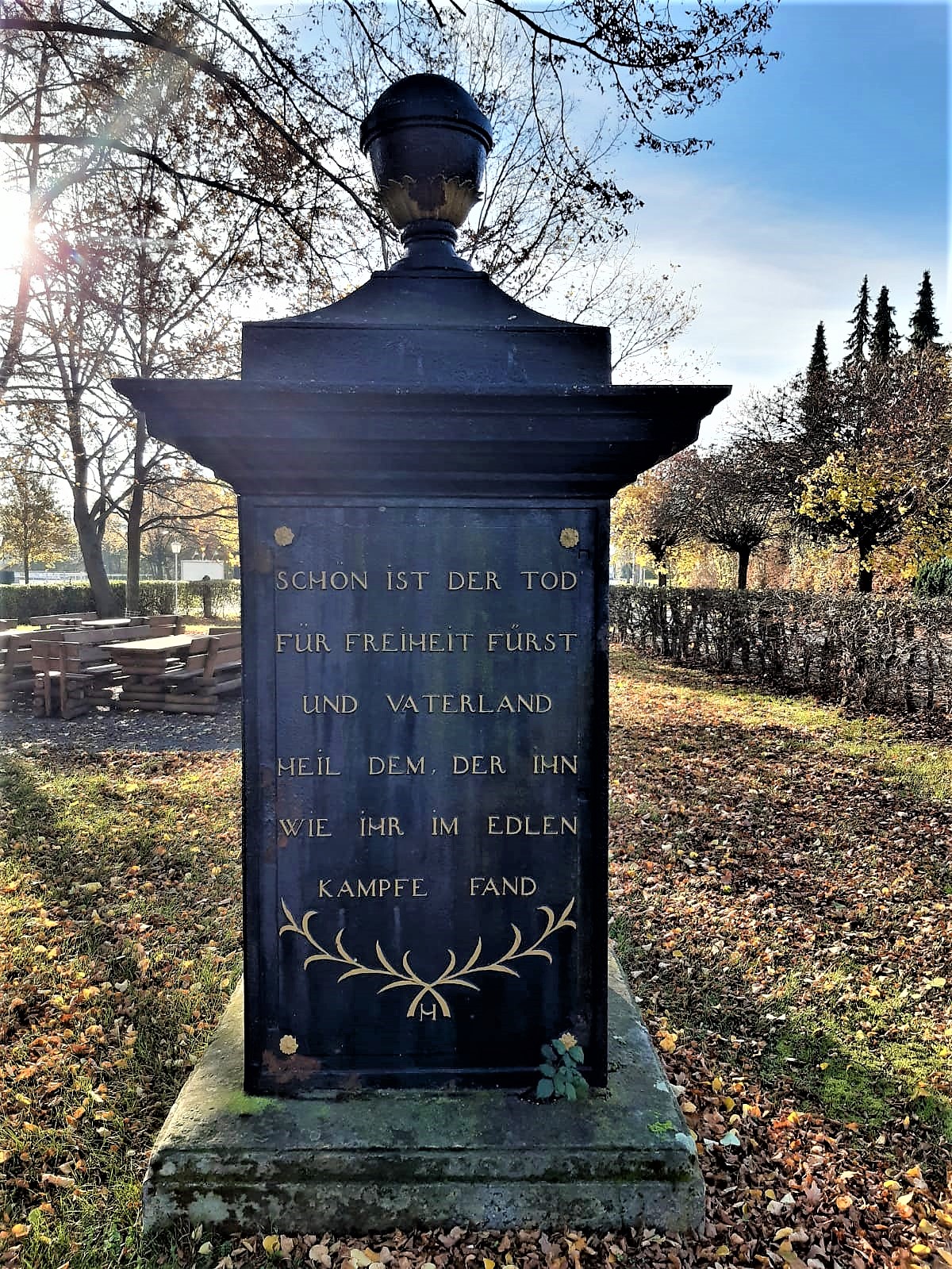 Rechts Schön ist der Tod für Freiheit Fürst und Vaterland Heil dem, der ihn wie ihr im edlen Kampfe fand