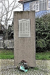 An der Ecke Rheinhausenstrasse/Grünestrasse; dreieckige Säule, Tafeln an jeder Seite, a) Widmung, b) Namen, c) Zugverbindungen Herbolzheim-Auschwitz