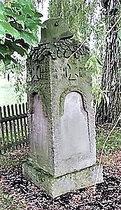 Hoher steinerner Pfeiler mit Stahlhelm, Eichenlaub und Axt bekrönt. Inschrift zwischen reliefartigen Eisernen Kreuzen. Namen nicht mehr lesbar.