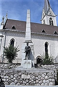 Denkmal (ohne Namen) vor der Pfarrkirche St. Hermagoras und Fortunatus